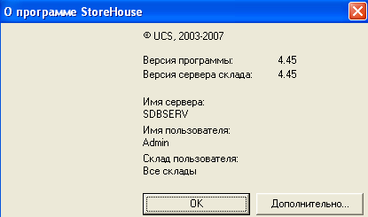 С помощью подпунктов Вызов справки и Контекстная справка этого пункта главного меню, осуществляют вызов справочной системы StoreHouse. Пункт О программе… вызывает окно, содержащее сведения о версии программы, версии сервера, имени сервера, имени пользователя, и складах, к которым у данного пользователя открыт доступ. Нажатие на кнопку «Дополнительно» вызывает на экран окно со списком используемых библиотек.