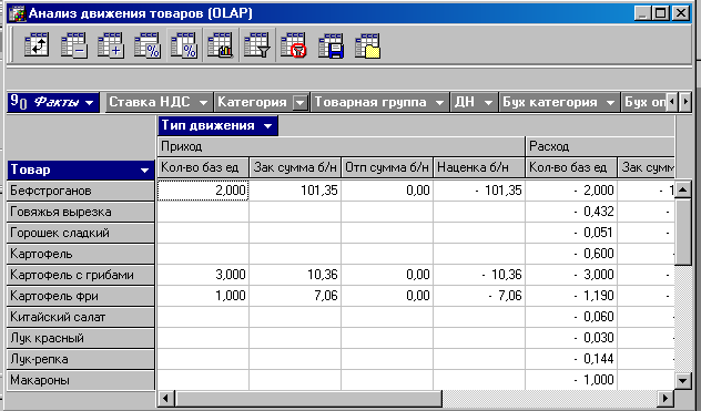 Этот отчет отражает информацию о движении продуктов на предприятии. Перед построением куба пользователь определяет период и условия формирования отчета.