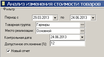 В отчет выводятся блюда, с отклонениями себестоимости превышающую заданную в один из дней интервала на определенный процент.
