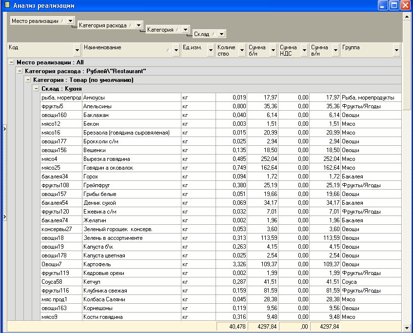 Отчет «Анализ реализации» содержит информацию о продуктах, списанных на основании документов расхода.