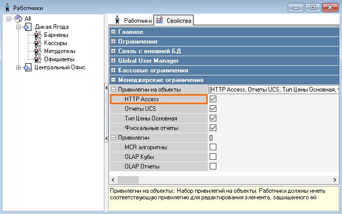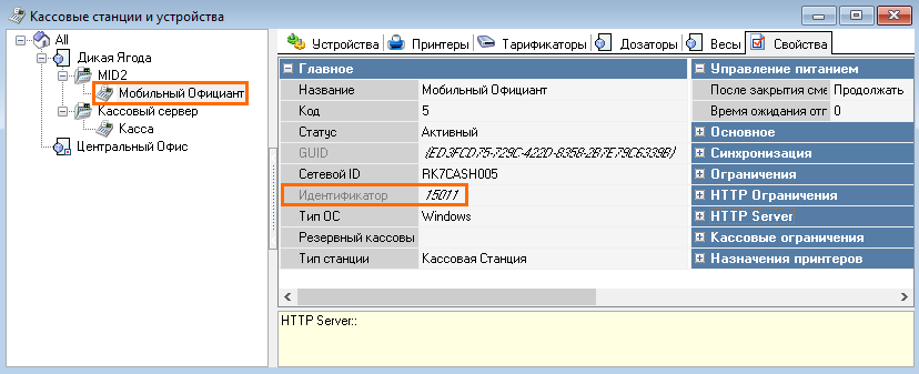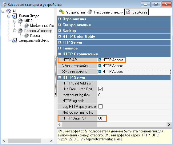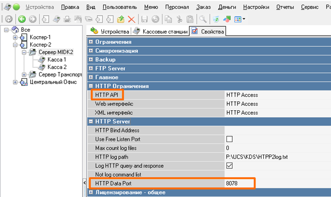 Зайдите во вкладку Свойства кассового сервера, чтобы узнать номер HTTP Data port:- Перейдите в раздел HTTP Ограничения и в поле HTTP API выберите HTTP Access