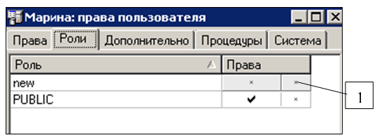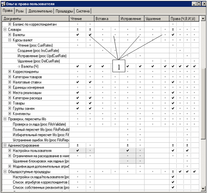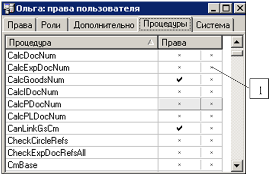 Если выбран режим представления прав Показывать права администратора (пункт главного меню Документ), в специальном столбце (см. цифра 1 на скриншотах ниже) на страницах Права, Роли, Процедуры, Система справочника Список пользователей отражаются права пользователя как администратора.
