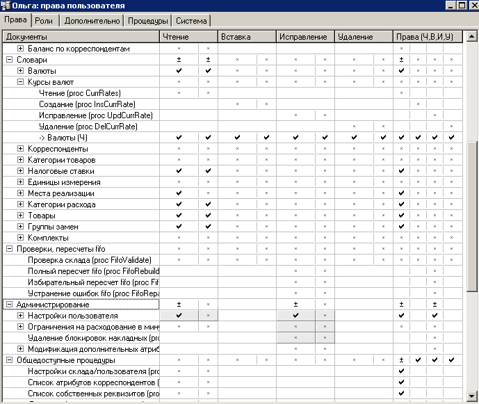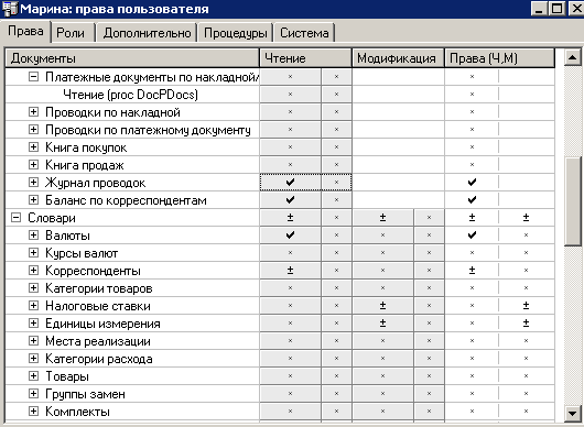 Персональные права пользователя из колонок Чтение, Вставка, Исправление, Удаление (или Чтение, Модификация).