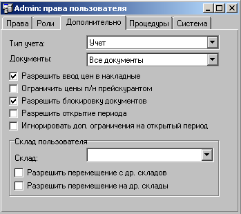 Если работа пользователя ограничивается одним подразделением, то в поле «Склад:» из списка выберете название склада. Если пользователь имеет право на работу со всеми подразделениями, то поле «Склад» должно быть пустым.