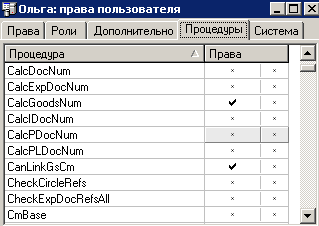 Назначение права в списке процедур равнозначно назначению права в списке на странице Права для права, содержащего в скобках название этой процедуры.