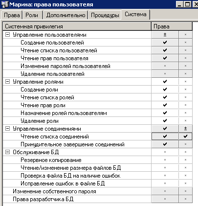 Столбец Системная привилегия содержит список прав по управлению пользователями, ролями и на действия с системой. Колонка Права содержит флаги принадлежности этих прав пользователю.