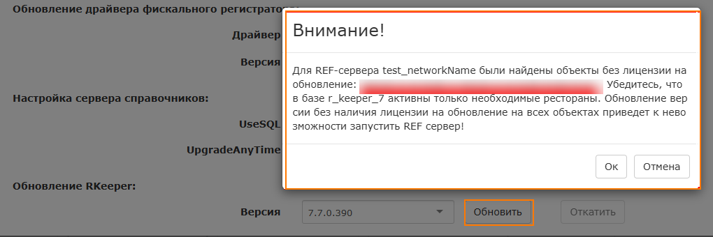 Если в базе r_keeper будут найдены активные рестораны без активной лицензии на обновление, то отобразится сообщение: