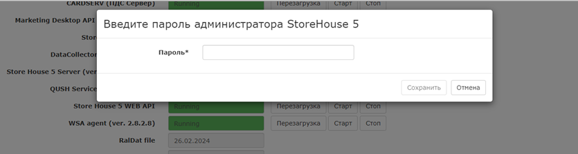 Если введенный пароль корректный, система запустит обновление объекта до указанной версии, после окончания процедуры, версия в статусе службы StroreHouse 5 также должна изменится.