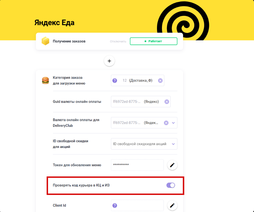 Если код действителен, система подтвердит успешную проверку, и вы сможете передать заказ курьеру. Для начала работы включите настройку на странице интеграции с Яндекс.Едой в административной панели.