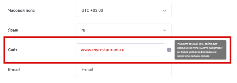 - Поддержаны новые теги для фискальных регистраторов. При заполнении поля Сайт в настройках заведения при онлайн оплате заказа адрес сайта будет передан как реквизит 1187 «место расчетов» для печати на фискальном чеке.