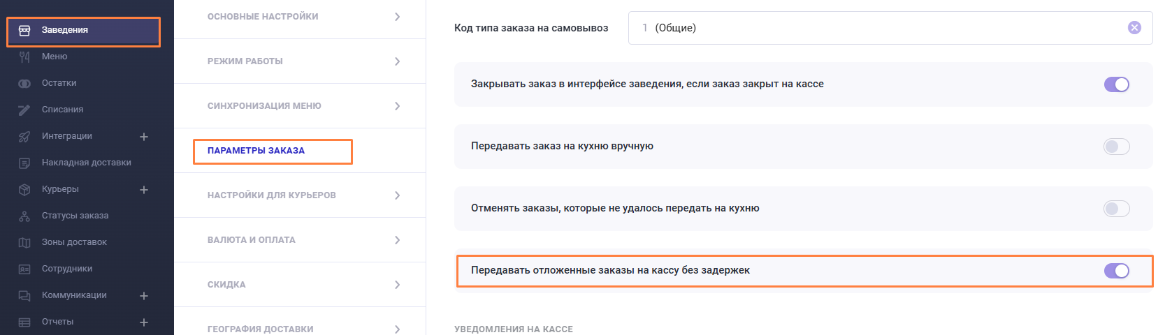 - Передавать отложенные заказы на кассу без задержек — новая настройка для заказов на будущее время. Добавили возможность передавать на кухню заказы, с доставкой к определенному времени, без задержек. Если настройка включена, то заказы будут передаваться на экраны r_k KDS PRO сразу после создания, без учета отложенного времени начала готовки. Актуально для объектов, на кухне которых важно видеть все запланированные заказы, а не только те, которые следует готовить прямо сейчас.