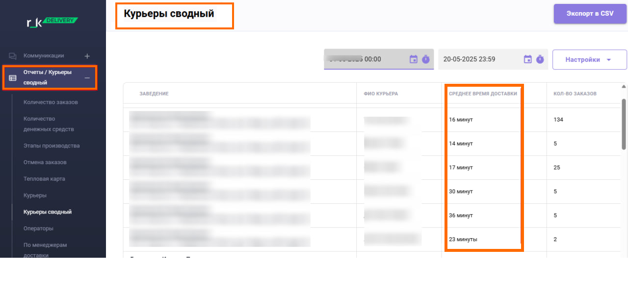 - Дополнили отчет по курьерам сводный данными по среднему времени доставки для каждого курьера за период. Если курьеры заведения работают по зонам доставки, этот показатель, наряду с количеством доставленных заказов, может учитываться для расчета заработной платы.