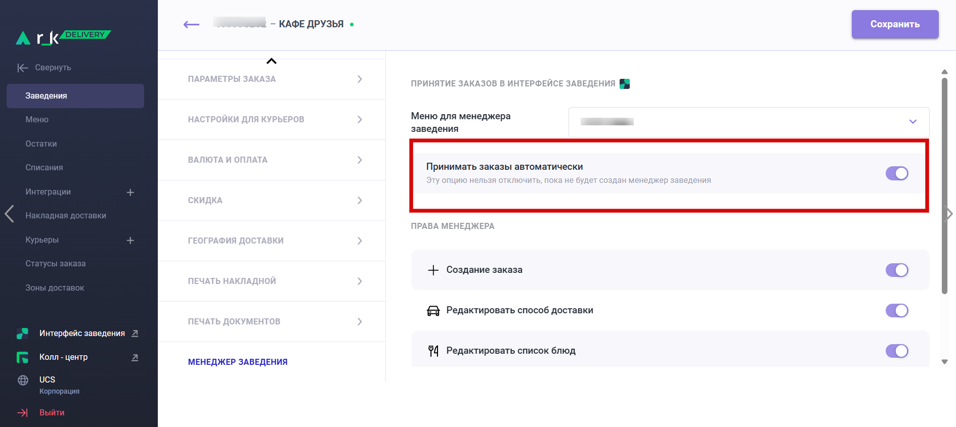- Оптимизировали настройку по принятию заказа в заведении: для каждого заведения можно настроить либо ручное, либо автоматическое принятие заказа. В ближайшем будущем поддержим исключения для более гибкого управления работой с заказами.