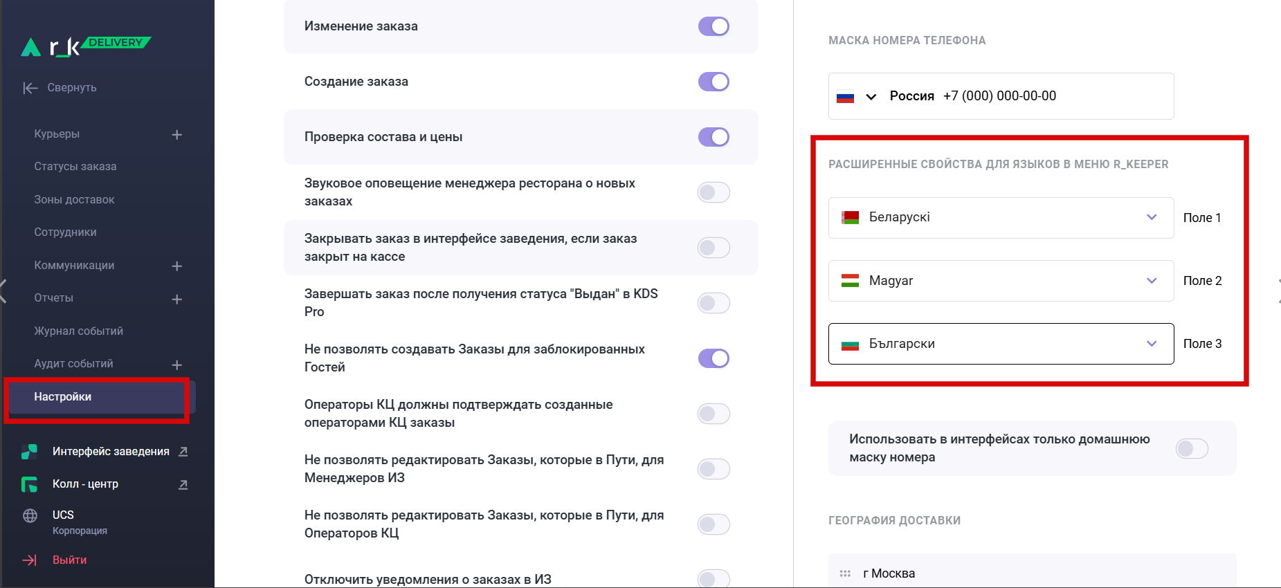 - Поддержали мультиязычность блюд в меню. Если приложение или сайт для гостей работает на нескольких языках, то название и описание блюда можно выводить из заданных полей в менеджерской. Для включения мультиязычности выберите нужные языки, соответствующие полям в настройках корпорации в Административной панели.