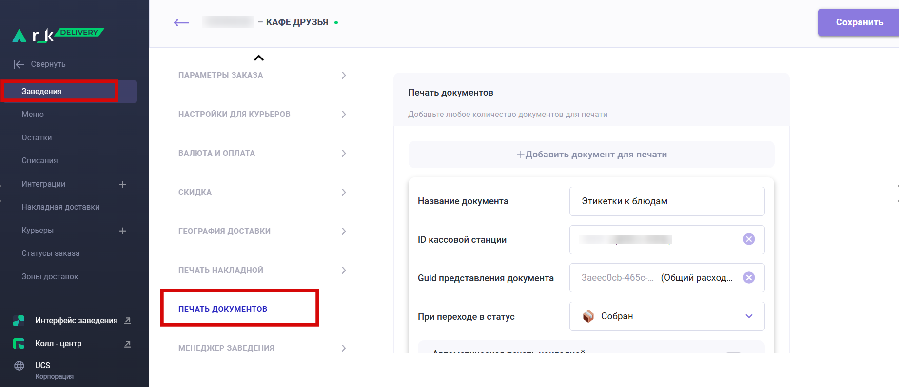 В административной панели в разделе настроек заведения добавили блок Печать документов: теперь можно выбрать макет из справочника, указать ID кассовой станции и условия печати (например, при переходе заказа в статус "Собран"). Поддерживается автоматическая печать и ручной вызов печати из интерфейса Колл-центра — при заданных настройках пользователям доступен выбор печати документов по указанному названию. Для ручной печати документов нажмите на иконку дополнительных действий рядом со статусом заказа.