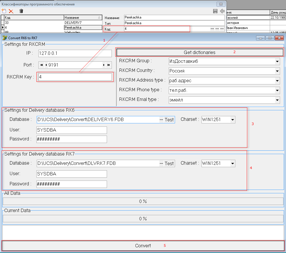 6. Запустить утилиту DLVRK6toRK7.exe, подключиться к СРМ, введя в поле RKCRM Key код классификатора ПО из п.5. В нашем случае, это 4.