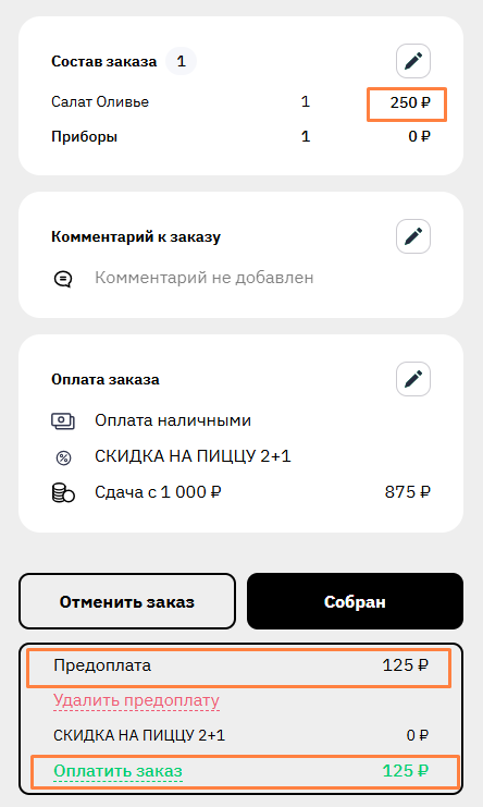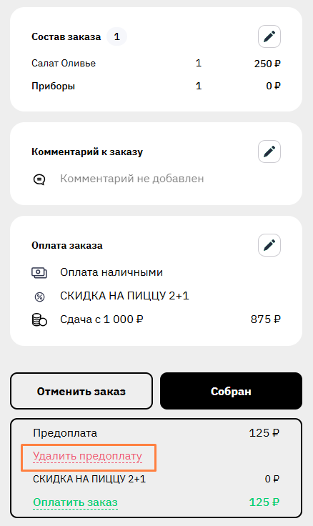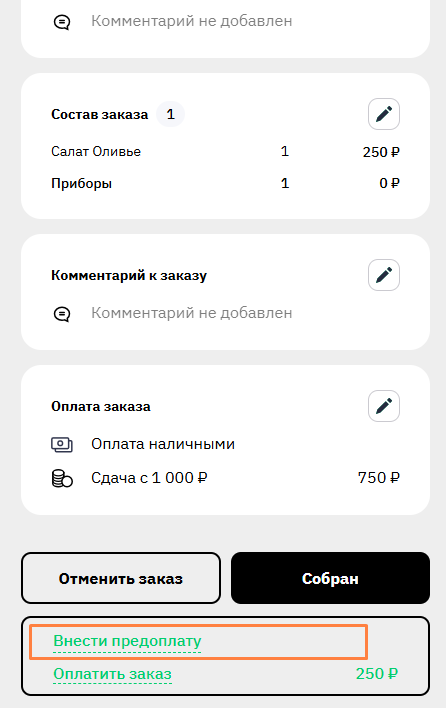 Если заказ передан на кухню, в него можно внести предоплату через интерфейс заведения или колл-центра.