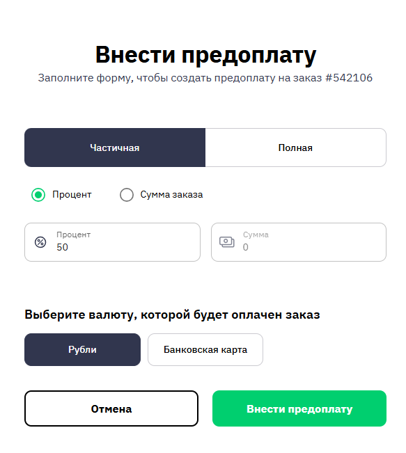 - Если выбрана частичная оплата, укажите, что надо ввести — сумму или процент от стоимости заказа