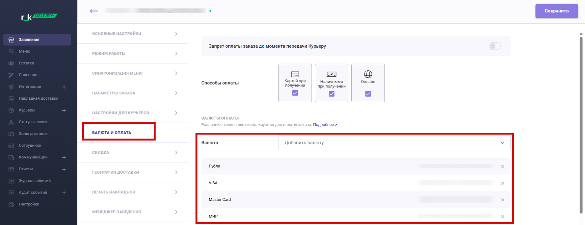 где guid — это guid ресторана, для которого не обходимо получить валюты. Guid-ы ресторанов можно получить, используя уже ранее существовавший метод API. Этот метод получения валют вернёт только те валюты, которые добавлены в карточке ресторана.
