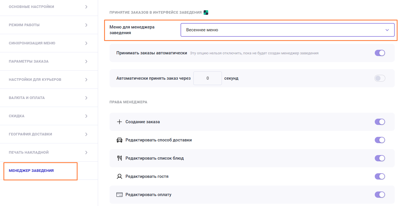 - В настройках Менеджера заведения проверьте выбор представления меню