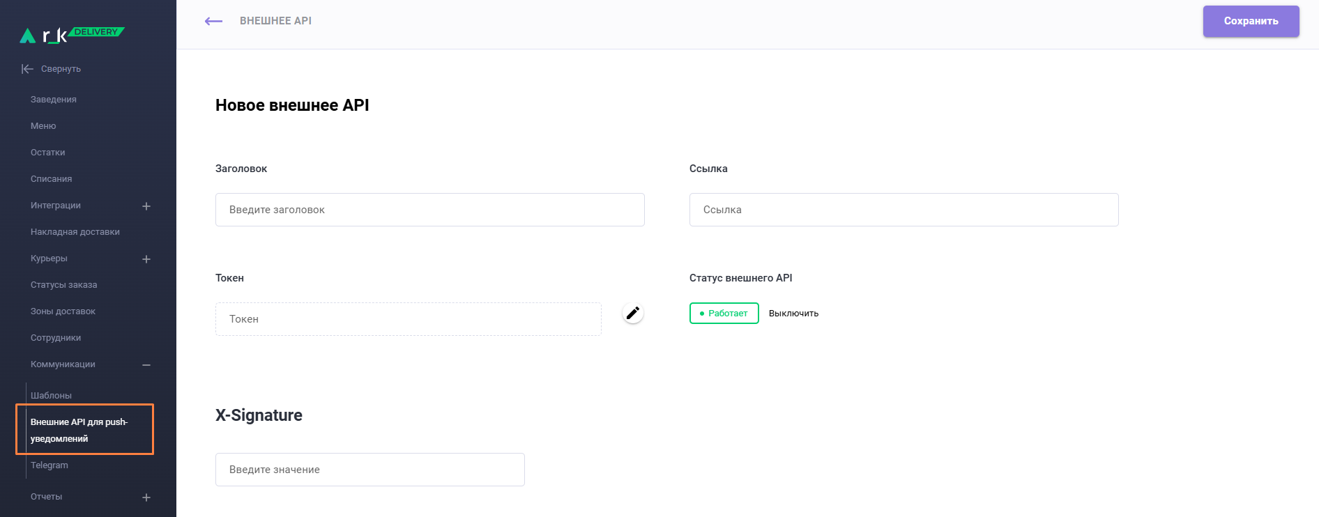 - В поле Ссылка добавьте URL внешнего API для отправки push-уведомлений от r_k Delivery