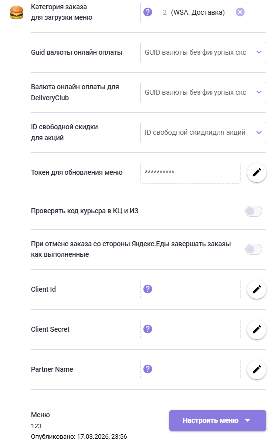 Перед созданием нового меню в r_k Delivery убедитесь, что блюда для будущего меню подходят к требованиям Я.Еда. Чтобы создать меню для Яндекс Еды: