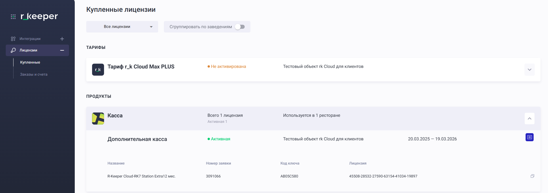 - Лицензии. Раздел позволяет работать с Системой лицензирования внутри личного кабинета r_k Office.