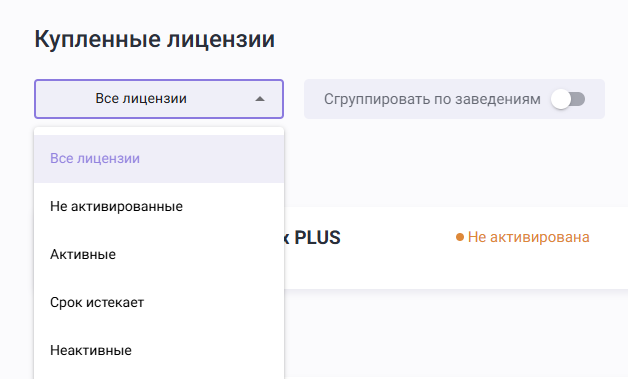 В данном окне доступна фильтрация лицензий и возможность сгруппировать лицензии по заведениям: