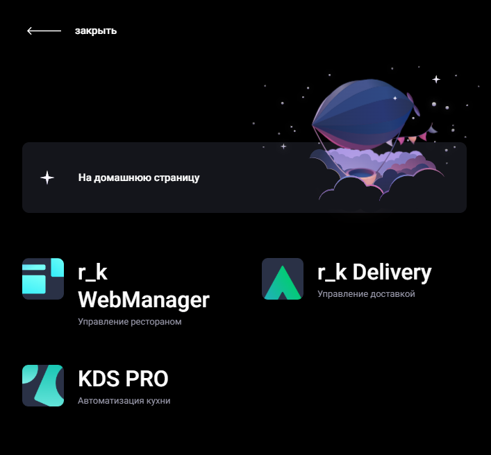 - Знакомство с продуктами r_keeper. Через данную вкладку доступен переход на официальный сайт r_keeper, где можно познакомится с выбранным на вкладке продуктом и оставить заявку на сотрудничество.