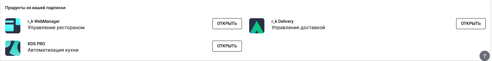 Например, в данном случае доступно три продукта: r_k Delivery, r_k WebManager и KDS PRO.