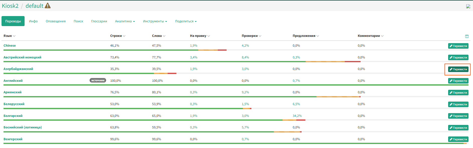 - Далее выберите язык, для которого будете делать перевод, и нажмите кнопку Перевести