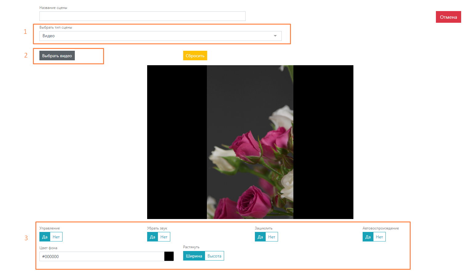 Guest Screen Пользовательская документация Режим настроек Сцены Current: Видео Видео Сцена Видео — демонстрация видео роликов. Например, рекламный ролик, ролик с рекомендациями или новинками меню. Для того, чтобы можно было загружать видео файлы настройте источник медиафайлов, подробнее читайте в статье Общие настройки. Выберите тип сцены Видео Выберите видео, нажав на кнопку Выбрать видеоПоддерживается формат видеороликов .mp4Если видео было выбрано ошибочно, нажмите кнопку СброситьПроизведите дополнительные настройки сцены:УправлениеУбрать звукЗациклить видео файлАвтовоспроизведениеЦвета фонаРастянуть ×