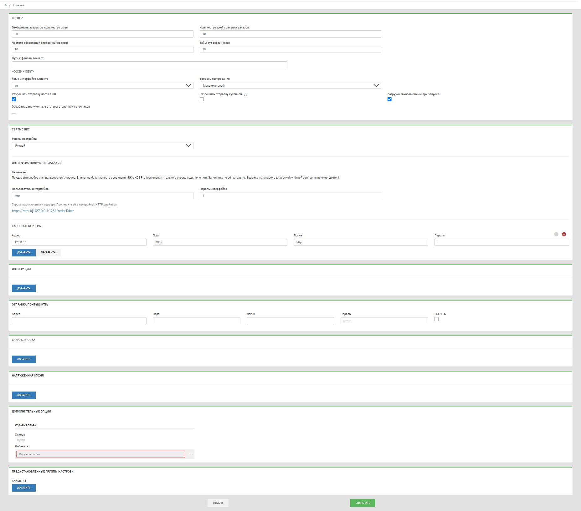 При выборе этой операции открываются режимы ввода параметров Сервера, Интерфейса получения заказов, и Кассовых серверов.
