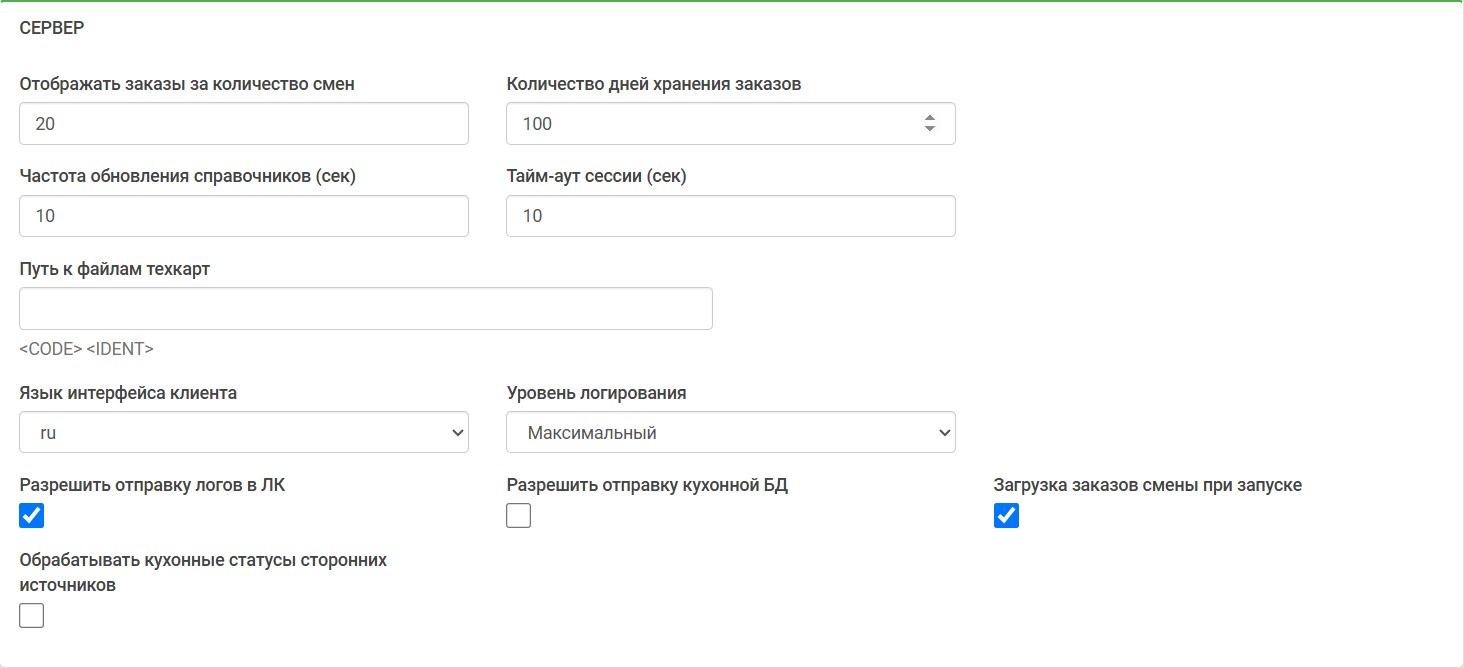 В разделе «Сервер» можно настроить максимальный срок жизни заказа на экранах r_keeper KDS PRO, частоту проверки обновлений справочников, тайм-аут сессии и путь к фотографиям блюд.