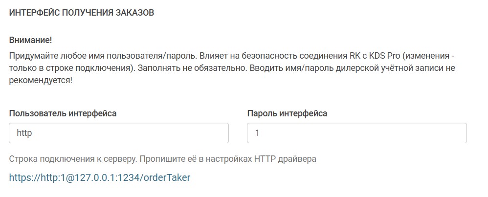 В разделе «Интерфейс получения заказов» можно указать пользователя интерфейса и пароль . Это произвольные данные, нужны для защиты передачи заказов в r_keeper KDS PRO (по умолчанию заказы передаются в открытом виде).