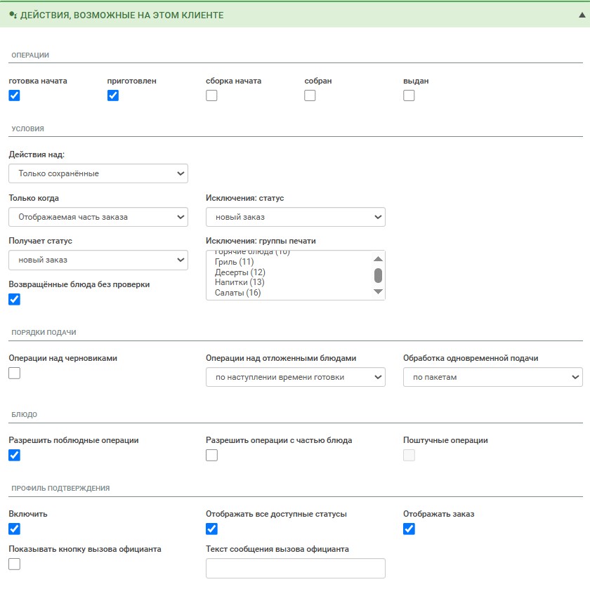 «Профиль подтверждения» — позволяет менять статус блюда/заказа с или без выбора статуса.