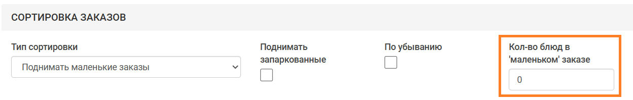 Поднимать маленькие заказы — сначала отобразятся маленькие заказы. Заказ будет считаться маленьким, если количество блюд меньше или равно числу в поле Кол-во блюд в "маленьком" заказе.