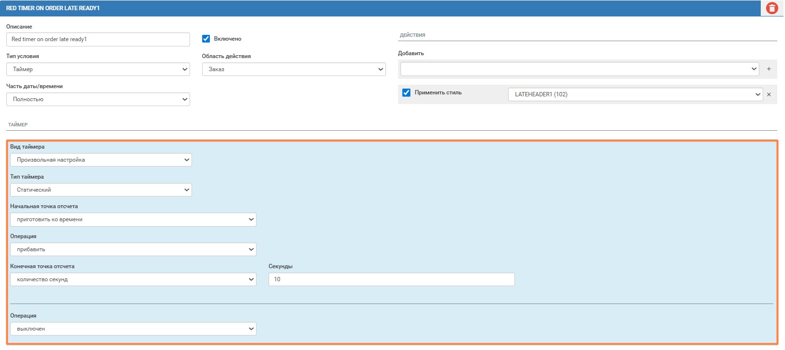 • Red timer on order late ready 1 — отображать таймер на оранжевом фоне за N секунд до теоретического времени окончания готовки заказа. Время задается в настройках условия.