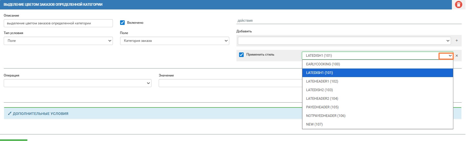В результате будет создано условие: при получения заказа с категорией заказа «Ресторан2» фон строк с блюдами будет бежевым, а с остальными категориями заказа – стандартным белым.