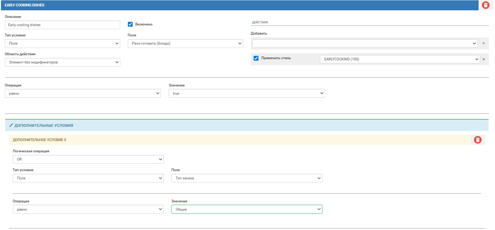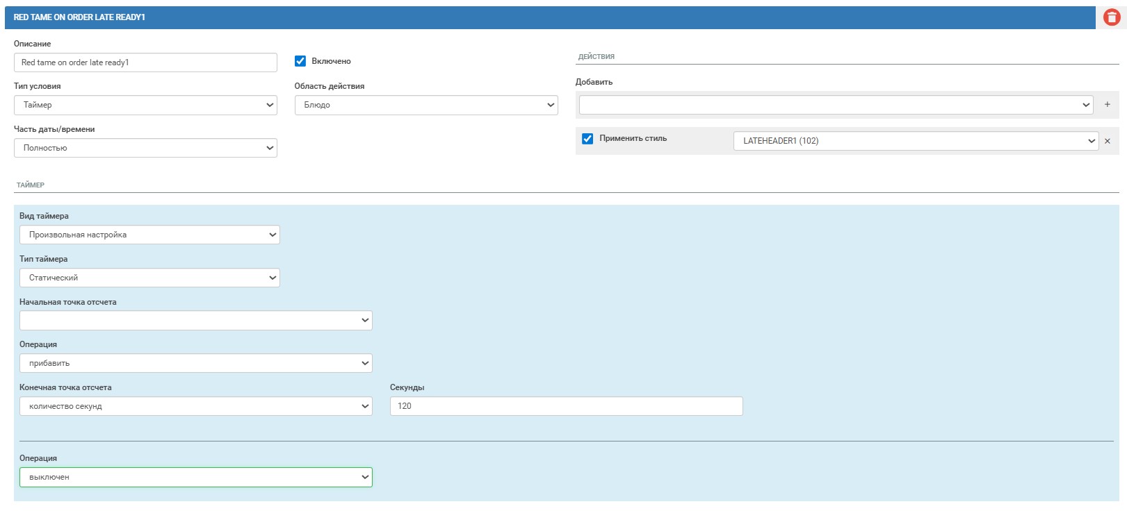 • Red dish on late ready 1 — отображать строку с блюдом на оранжевом фоне за N секунд до теоретического времени окончания готовки. Время задается в настройках условия.