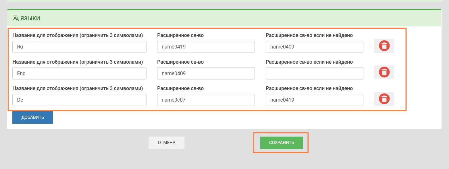 В строках задайте соответствия названия языков и ранее настроенных расширенных свойств. Нажмите кнопку Сохранить.