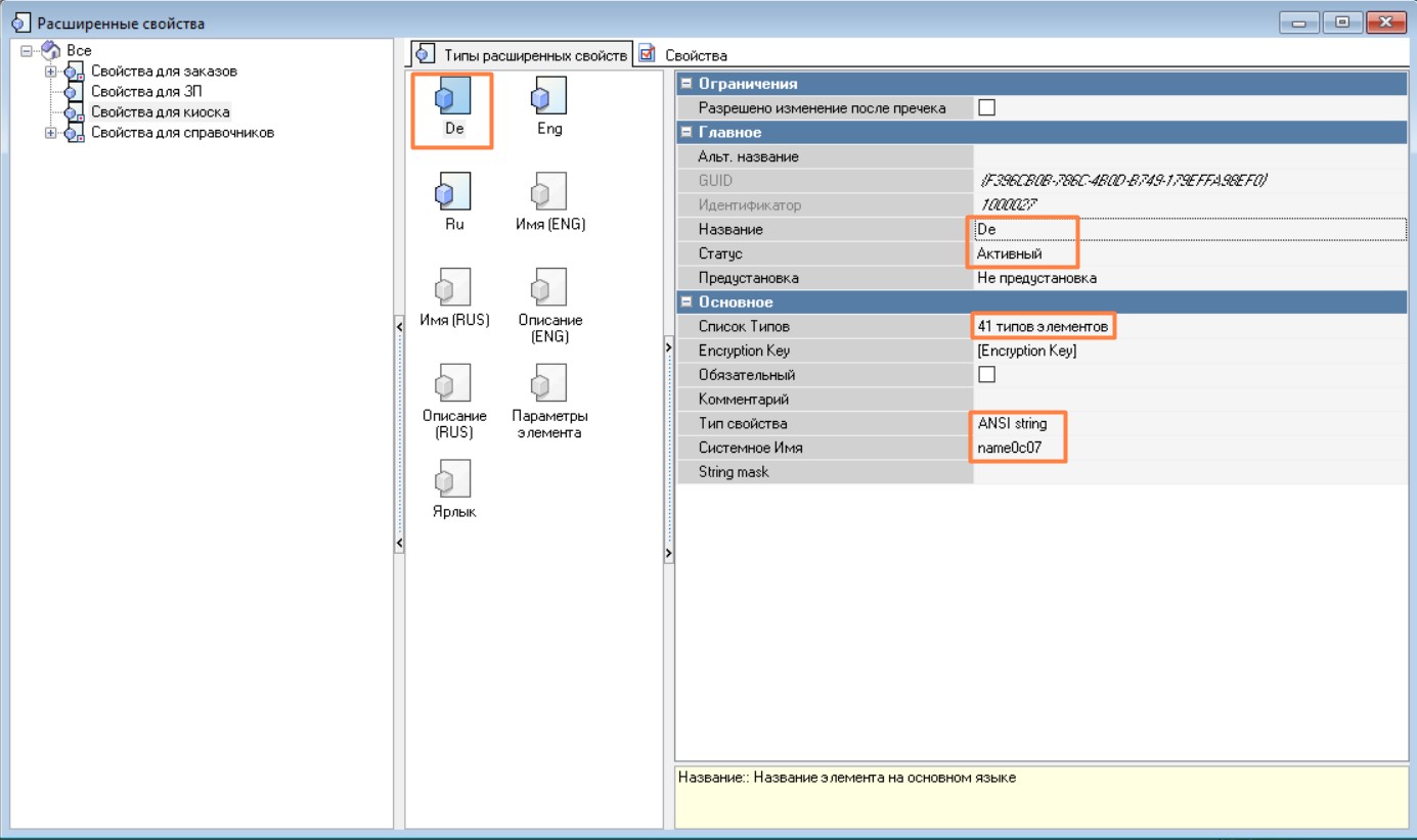Задайте расширенным свойствам Название, Системное Имя, Тип свойства, переведите статус в Активный и выберите необходимые типы элементов в Списке Типов.