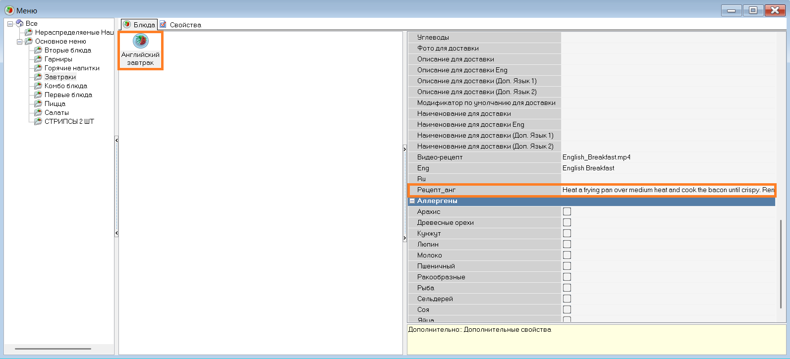 В справочнике Настройки > Настройка > Расширенные свойства создайте необходимое количество типов расширенных свойств для рецептов на разных языках.