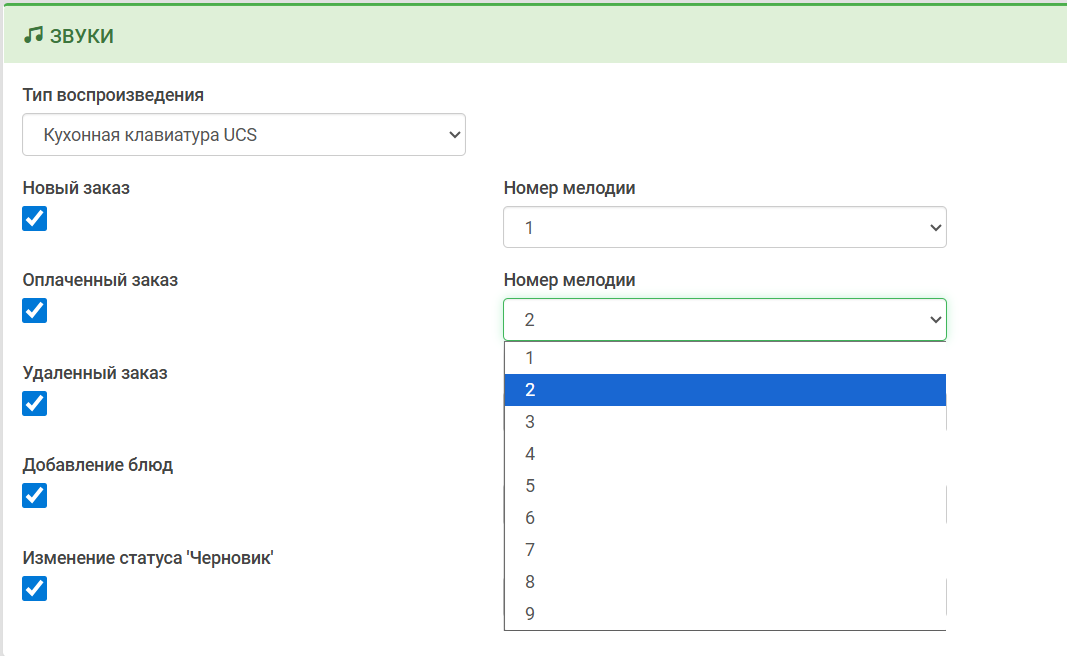 В данном разделе настраиваются звуки, которые проигрываются при изменении состояния заказа: Новый заказ, Оплаченный заказ, Удаленный заказ, Добавление блюд (нового пакета) в существующий заказ и переход заказа из статуса "Черновик" в активный.