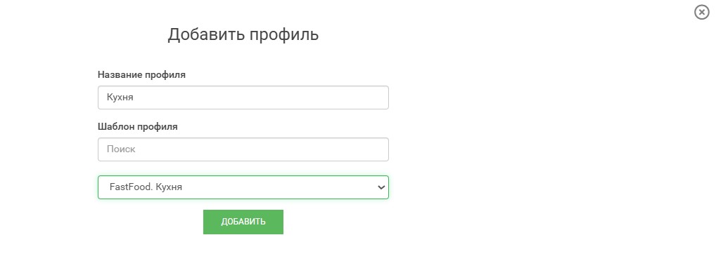 Первый профиль для клиента автоматически формируется при создании клиента. Чтобы добавить новый профиль нажмите кнопку «Плюс» в списке профилей у нужного клиента. В открывшемся окне введите название профиля и выберите нужный шаблон.