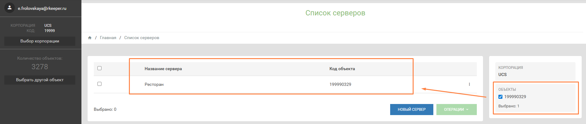 Выберите нужный объект (ресторан) после чего в списке серверов отобразится список серверов r_keeper KDS PRO, созданных для данного объекта.