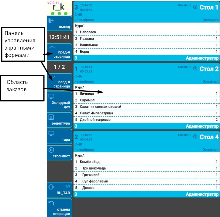 Экранная форма состоит из области заказов и панели управления экранной формой (вертикальная панель слева).