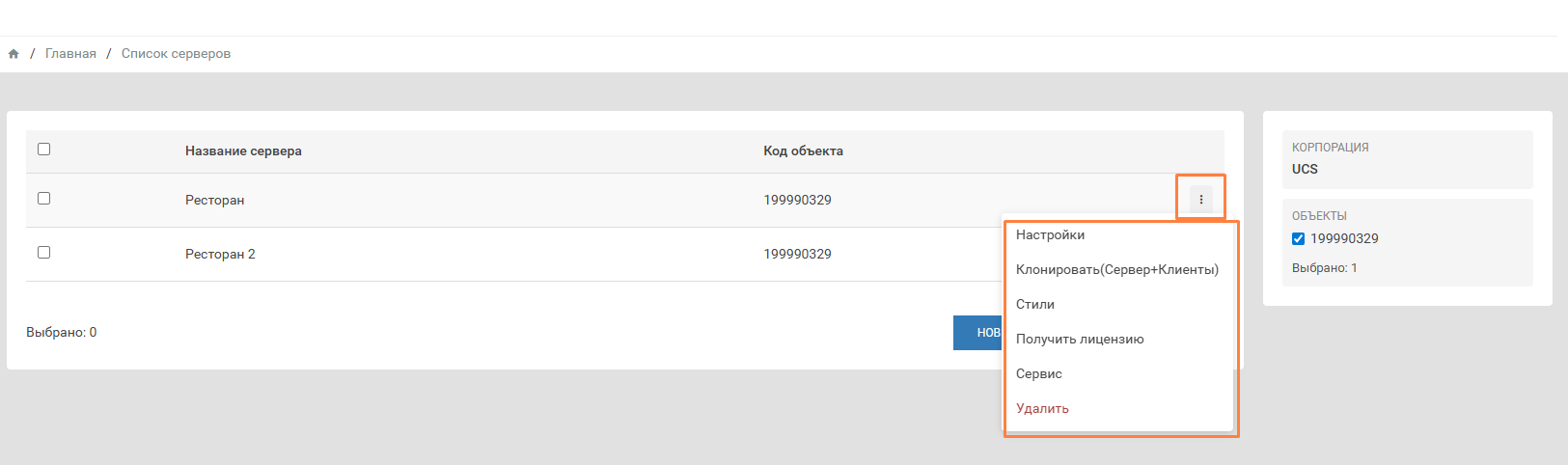 Для создания конфигурации сервера необходимо нажать на кнопку списка операций в верхнем правом углу.