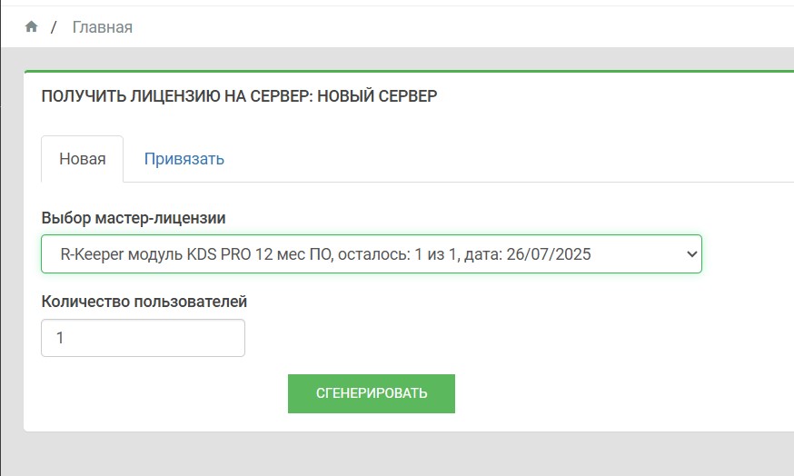 Для получения и установки лицензии войдите в режим конфигурирования сервера. Выберите операции «Получить лицензию». В открывшемся окне выберите тип лицензии, мастер-лицензии и укажите количество пользователей.. Тип лицензии - выберите тип лицензии из ниспадающего списка. R_keeper KDS PROдо версии 1.6.0 не позволяет использовать разнотипные лицензии, а также лицензии с разным сроком окончания на одном объекте. Начиная с 1.6.0 версии эта проблема решена. Если используется версия r_keeper KDS PRO до 1.6.0. в личном кабинете необходимо использовать опцию "для версий до 1.6.0" в противном случае "для версий после 1.6.0 включительно". Выбор мастер-лицензии - предварительно необходимо на сайте https://l.ucs.ru/ приобрести мастер-лицензию и выбрать ее из списка. Количество пользователей – вводится количество «клиентов» r_keeper KDS PRO , разрешенных для данного сервера. После этого нажмите кнопку «Сгенерировать». Если по лицензия уже была сгенерирована (например, удален сервер) то на закладке «Привязать» можно выбрать ранее созданную лицензию. Далее нажмите кнопку «Привязать». Если лицензия используется будет выдана ошибка. После получения лицензии на кнопке сервера отобразится соответствующая информация.