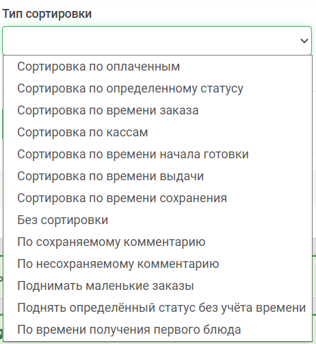 Сортировка по времени начала готовки — используется для отложенных заказов. При данной настройке заказы отображаются на экране по времени сохранения, если есть заказы с отложенными порядками подачи, то такие заказы будет последними на экране.